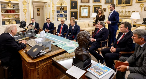 Ob die Oligarchen auf das Projekt einsteigen, ist nicht bekannt. Jedenfalls betrachten sie am 4. November 2025 im Büro des selbsternannten Weltkaisers das Modell seines Triumphbogens am Potomac interessiert und lauschen seinem Marketing.