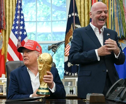 Infantino übergibt dem Mützenträger Trump im Januar 2026 kurz vor Davos einen von ihm ad hoc erfundenen FIFA-Friedenspreis mit den Worten: