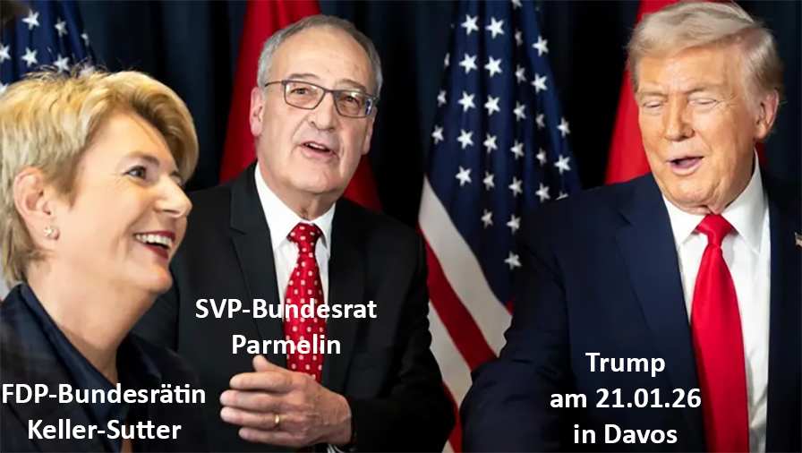 Die Unterwerfung unter Trumps Erpressung in Davos zeigt, was die SVP/FDP-Bundesratskoalition unter einer souveränen schweizer Problemlösung versteht. Lieber geht die Regierung vor Trump in die Knie, als sich an einer gemeinsamen europäischen Abwehr seiner Angriffe zu beteiligen.